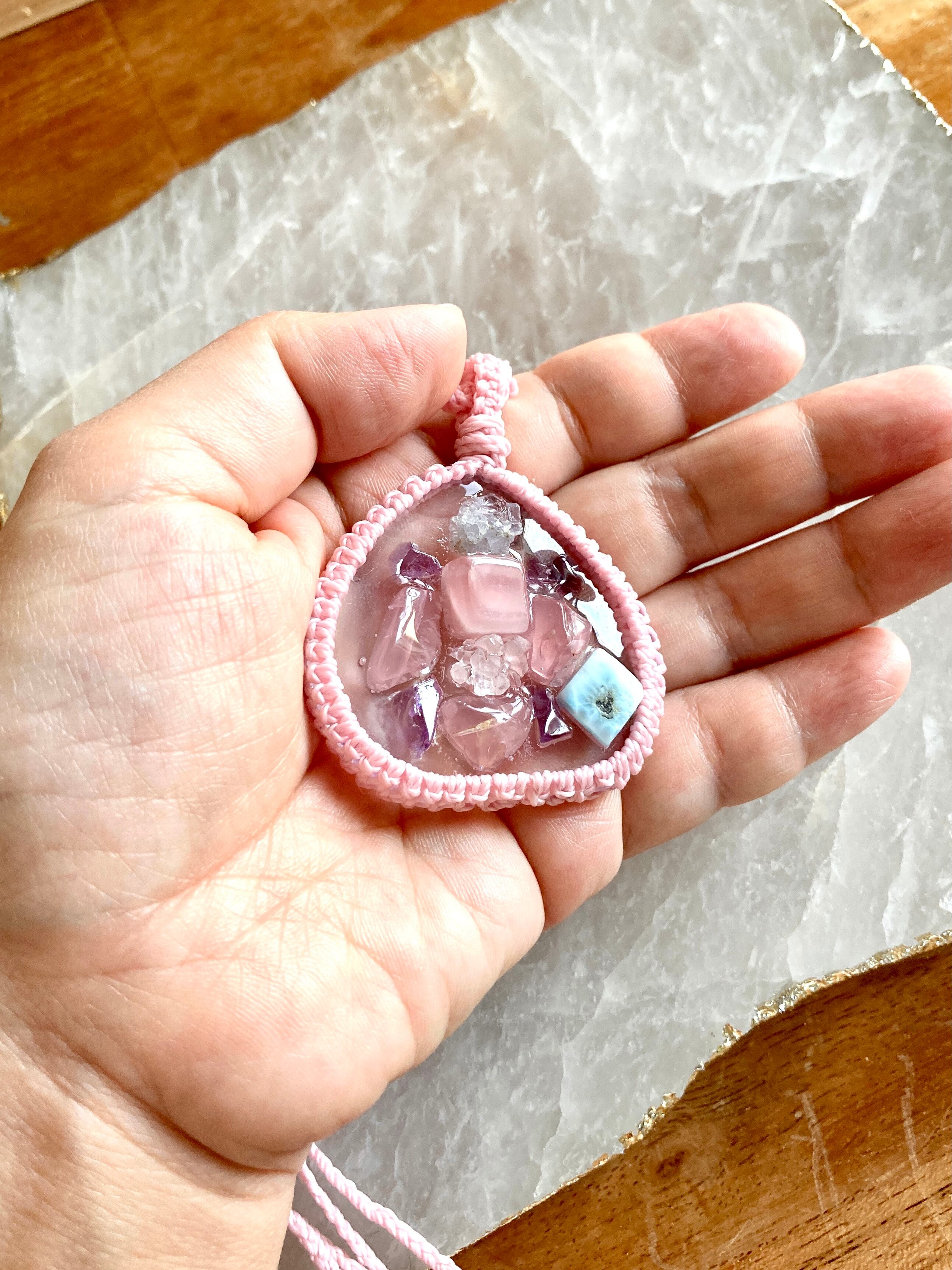 レジン:ディープローズクォーツ・モロッコ産水晶・アメジスト・セレスタイト・ラリマー